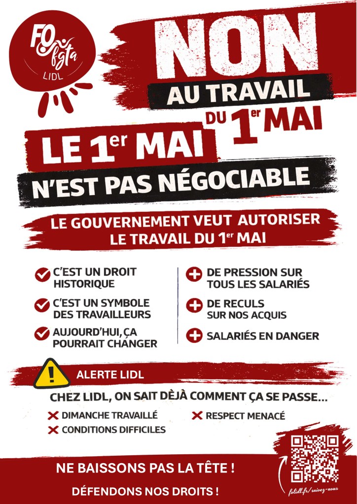 1er Mai travaillé, c’est NON ! Publié parFO LIDL10 avril 2026Publié dansNon classé Partager : Partager sur X(ouvre dans une nouvelle fenêtre) X Partager sur Facebook(ouvre dans une nouvelle fenêtre) Facebook J’aime chargement… Similaire