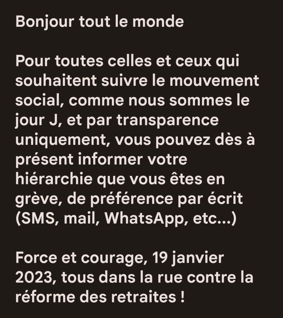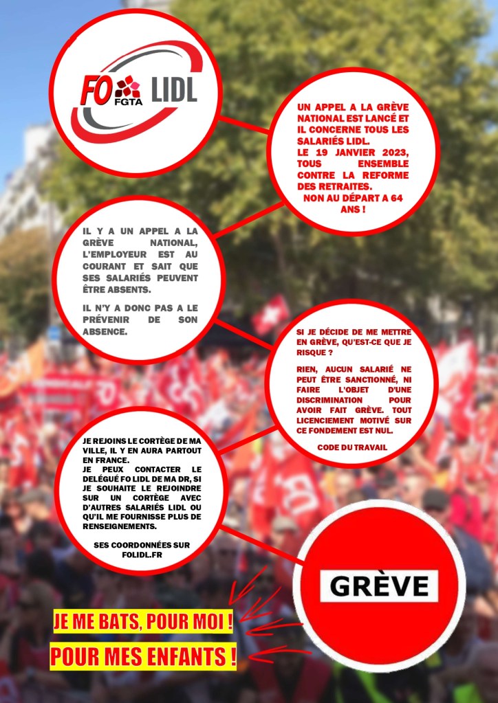 Tous dans la rue le 31 janvier Allez on se motive les collègues Lidl, c’est pour vous, c’est pour nous, c’est pour nos enfantsTous dans la rue contre la réforme des retraites !